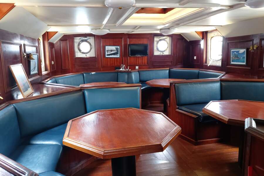 Le voilier à deux mâts est équipé d’une salle de séjour (29 m2) avec lecteur DVD, vidéo/TV, divers jeux et littérature sur le monde sous-marin ainsi que la flore et faune des Seychelles. Le sundeck est en partie équipé de matelas. Au niveau de la partie arrière, un voile solaire procure de l’ombre.