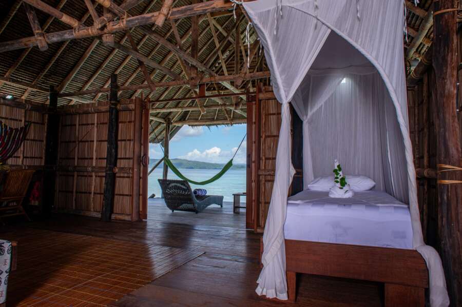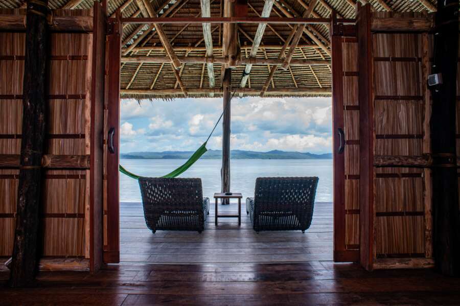 Les 2 Papuan Water Cottages sont situés directement sur le jetty principal et disposent d'un lit double ou de deux lits simples, ainsi que d'une petite véranda avec hamac et chaises.