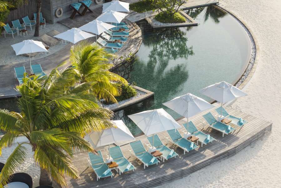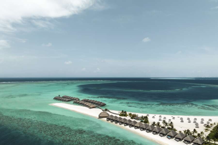 Die 39 Water Villas (66 m²) sind identisch eingerichtet und stehen in der Lagune auf Stelzen und sind durch einen Steg mit der Insel verbunden. Eine Leiter führt von der halbüberdachten Terrasse direkt ins Wasser.