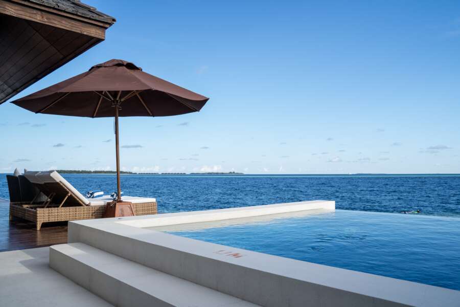 Die 36 einzelstehenden Deluxe Water Villas (126 m²) sind alle in die Lagune gebaut und durch einen Steg mit der Insel verbunden. Sie bieten mehr Privatsphäre und Wohnfläche und verfügen zusätzlich über einen Plunge Pool (7 m²) auf der Sonnenterrasse sowie ein Bad mit Meerblick.