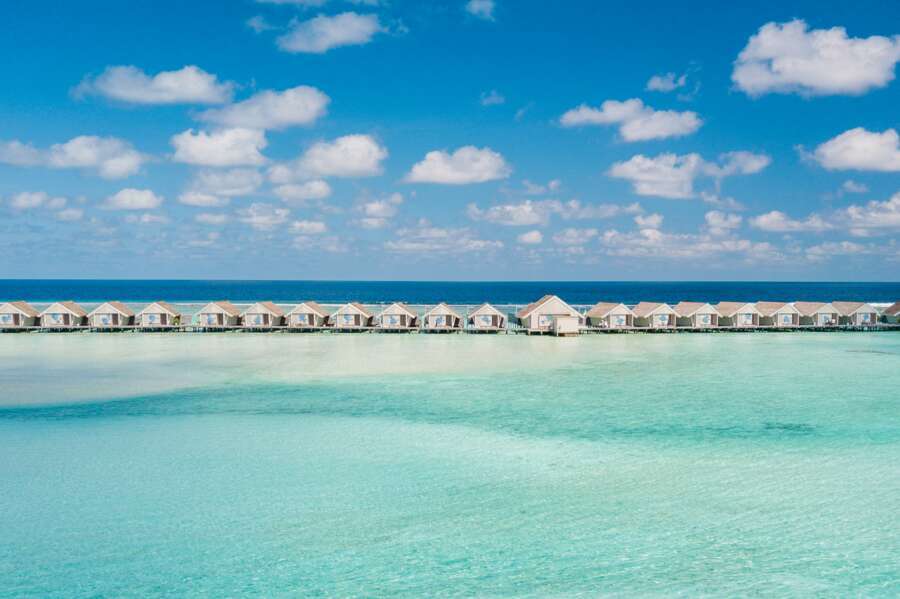 Die 38 Water Villas (98 m²) stehen auf der Westseite der Insel und sind auf Stelzen in die Lagune gebaut.