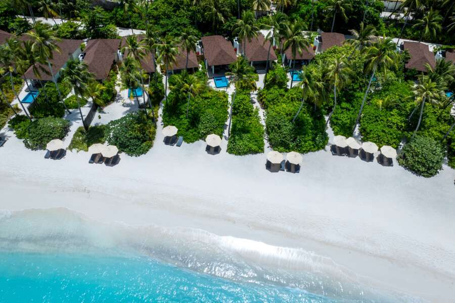 Die 17 Beach Villas (88 m²) befinden sich auf der Südwestseite, und sind einzelstehend. Das Badezimmer hat zusätzlichen einen Aussenbereich mit einer Badewanne sowie Dusche. Liegestühle befinden sind vor dem Zimmer.
