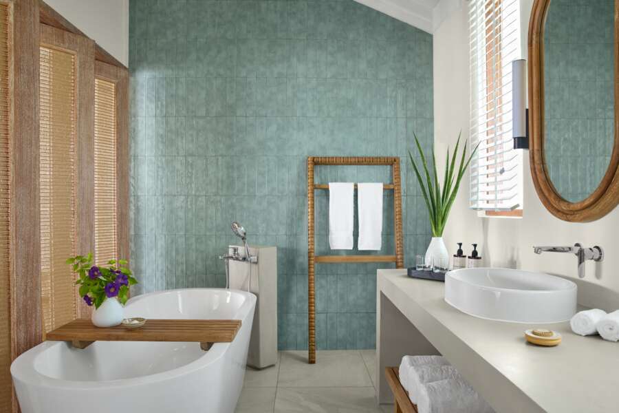 Die 14 Sunset Beach Villas (38 m²) liegen direkt am Strand, sind einzelnstehend und haben ein halboffenes Badezimmer mit Dusche und Badewanne.