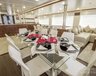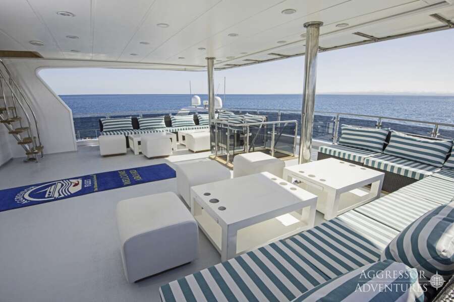 Hauptdeck mit modernem Essbereich, Lounge mit TV/DVD, Aussenbereich mit Kameratisch. Weitere Lounge und Liegestühle auf dem Oberdeck. Überdachtes Sonnendeck mit einem Jacuzzi und Bar.