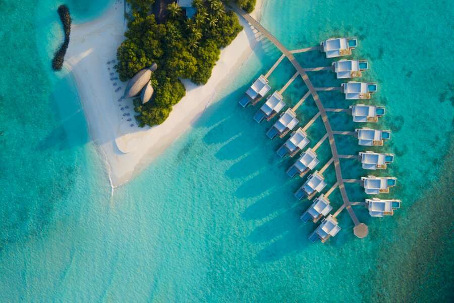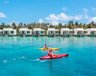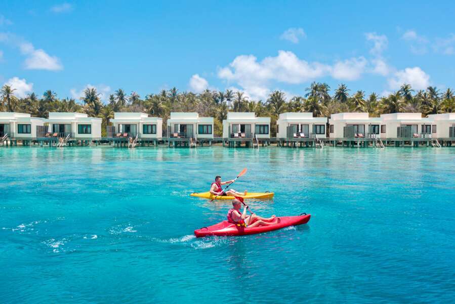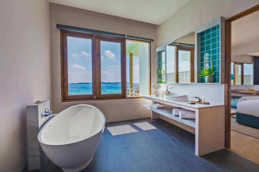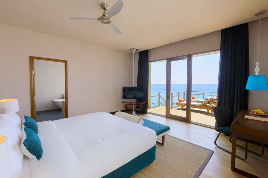 Die 24 Water Villas (85 m²) sind auf Stelzen in die Lagune gebaut und über einen Steg mit der Insel verbunden. Sie haben ein geschlossenes Bad mit Badewanne, Regendusche, WC und über die Terrasse mit Liegestühlen führt ein direkter Zugang ins Meer.