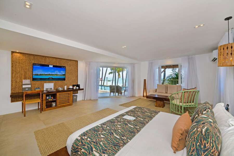 Alle 63 Zimmer sind in schlichter Eleganz gepaart mit zeitgenössischem, mauritischem Stil eingerichtet und liegen entweder im Erdgeschoss oder im ersten Stock in der tropischen Gartenanlage. Die 20 Charm Zimmer (30-35 m²) verfügen über ein Badezimmer mit Dusche, WC, Klimaanlage, Minibar, Tee-/Kaffeekocher, Nespresso-Maschine, Safe, Haartrockner, Telefon, TV, Balkon oder Terrasse. Die 21 Deluxe Zimmer (36-42 m²) und die 13 Suites (45-54 m²) sind gleich ausgestattet, sind aber jeweils etwas grosszügiger gestaltet. Zudem verfügt das Hotel über 3 Junior Suites (55-60 m²) und 6 Senior Suites (70-90 m²).