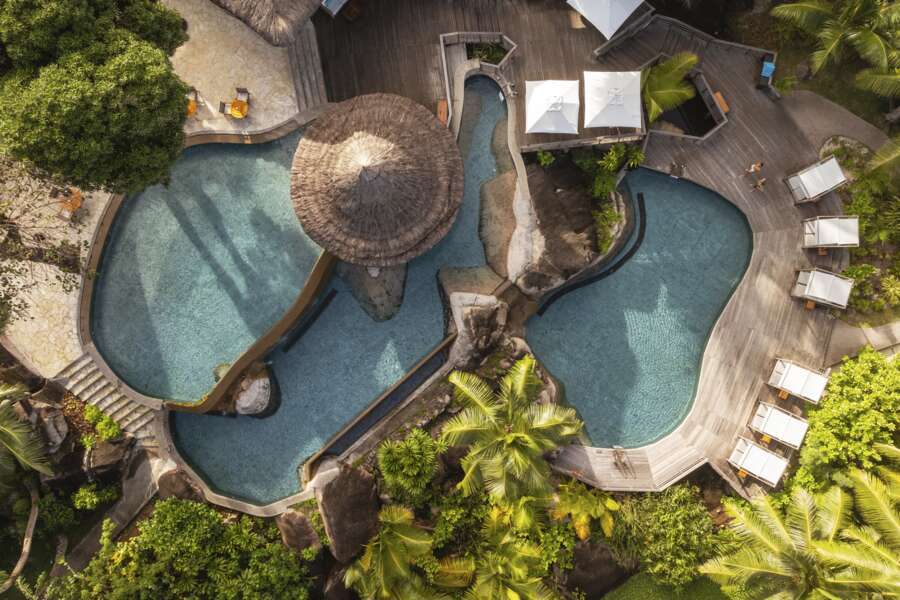 Auf dem herrlichen Areal befinden sich ein Swimmingpool, welcher sich über drei Ebenen verteilt, sowie 5 Bars, 3 Boutiquen, 1 Pro-Shop, Mediathek, Ankunfts-/Abreiselounge mit Umkleidekabine, ein Coiffeur sowie ein wunderschöner Spa. Im Eco Pavillion, werden Gäste über die endemische Natur und deren Umgang informiert.
