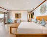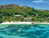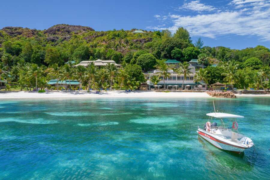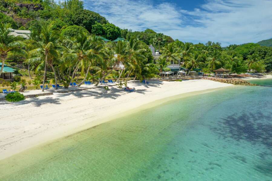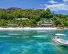 Angrenzend an den kilometerlangen Sandstrand Côte d’Or im Nordosten von Praslin mit fantastischem Panoramablick über die Bucht.