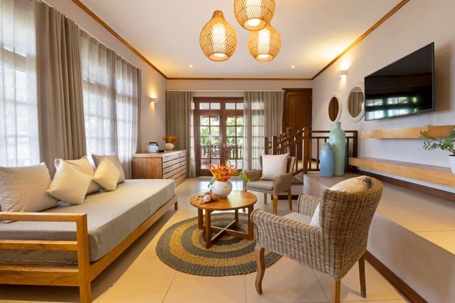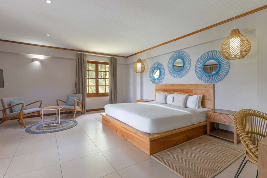 Die 18 ein- und zweistöckigen Bungalows liegen verstreut am Hang verteilt und bieten einen wunderbaren Blick über den Garten und die Bucht. Alle Zimmer sind mit kreolischem und modernem Mobiliar eingerichtet sowie in Erd- und Blautönen dekoriert. Sie sind unterteilt in 4 Superior und 16 Deluxe Zimmer (beide 60 m²) sowie 10 Senior Suites (65 m²) und verfügen über Bad oder Dusche und separates WC, Klimaanlage, Telefon, TV, Minibar, Tee-/Kaffeekocher, Haartrockner, Safe und Terrasse. Die Suiten bieten ausserdem ein Wohnzimmer und einen begehbaren Kleiderschrank, und die 2 grossen Family Suites (120 m²) sind mit einem zusätzlichen Badezimmer, Deckenventilator und einer grossen Terrasse ausgestattet.