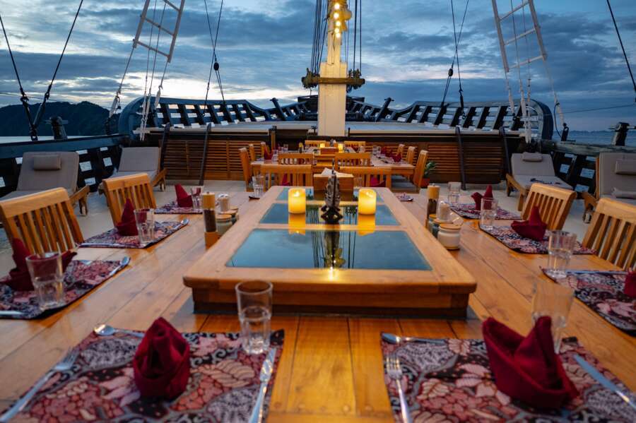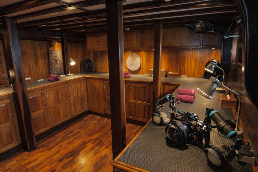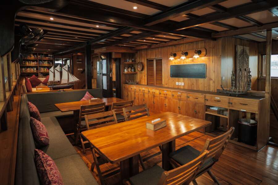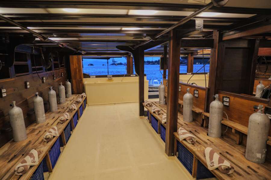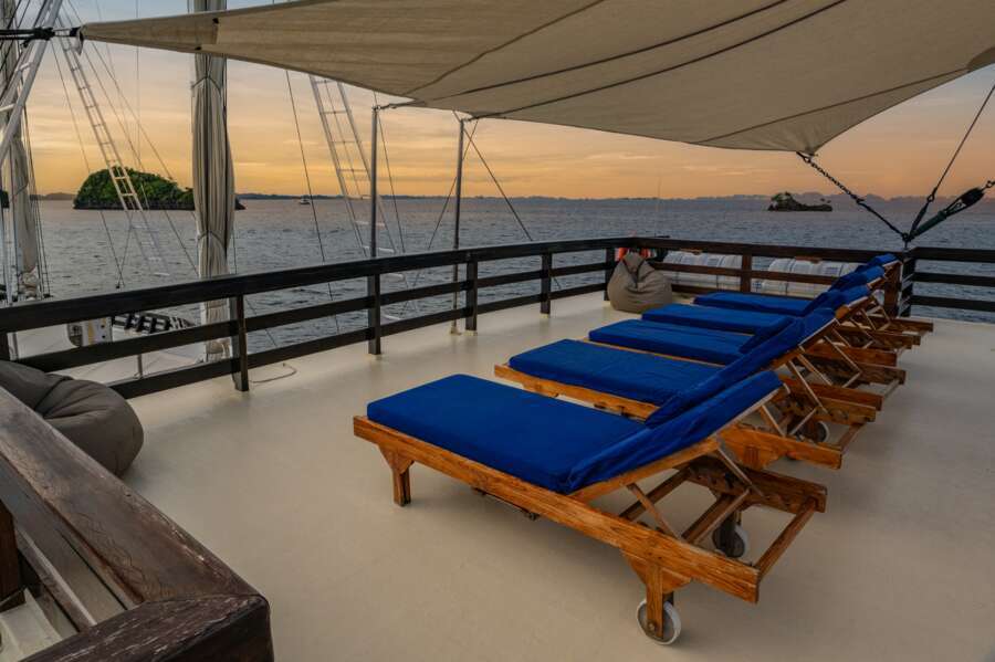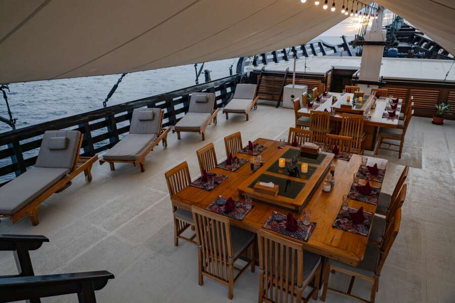 Ein wohldurchdachtes Konzept und das grosszügige Platzangebot gestalten das Leben an Bord überaus komfortabel. Das Restaurant und die Lounge mit TV und DVD sind grosszügig gestaltet und das riesige Sonnendeck mit Liegen und Schattendach für heisse Tage lädt zum Sonnenbaden und Relaxen ein. Neben dem überdachten Tauchdeck befindet sich der Kameraraum mit grosser Werkbank und Ladestationen.