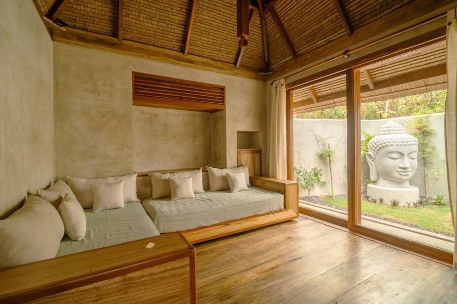 Die Double Bedroom Gardenvilla verfügt über zwei Schlafzimmer mit je einem separaten Badezimmer, einem Wohnbereich und eine private Terrasse mit Sicht in den Hotelgarten. Sie eignet sich für Gruppen und Familien bis 5 Personen.
