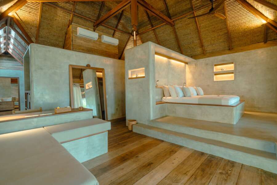 Alle Gästeunterkünfte sind minimalistisch und mit warmen Holzelementen ausgestattet und verfügen über Doppel- oder Einzelbetten, Klimaanlage, Badezimmer mit Dusche/WC und ein Moskitonetz.
