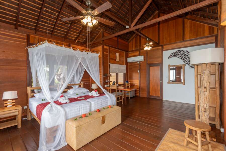 Die 18 Zimmer verteilen sich auf 12 Doppel- und 6 Einzelbungalows. Mit viel Liebe wurden die Zimmer aus lokalen Materialien gefertigt und mit Dusche, WC, Klimaanlage, Ventilator, Moskitonetz, Minibar und Terrasse ausgestattet.