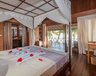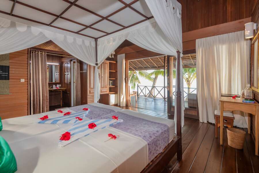20 Bungalows und 2 Beach End Bungalows liegen unter Schatten spendenden Palmen direkt am Strand. Sie sind aus lokalen Hölzern gefertigt und bieten dem Gast viel Platz. Sie sind ausgestattet mit Klimaanlage, Ventilator, Safe, Minibar und Moskitonetz. Auch die schönen, offenen Badezimmer und eine grosse, möblierte Terrasse lassen keine Wünsche offen. Die Bungalows werden mit Solarenergie versorgt. Die beiden Beach End Bungalows liegen am Ende des Strandes und sind am weitesten entfernt von Tauchcenter und Restaurant.