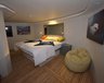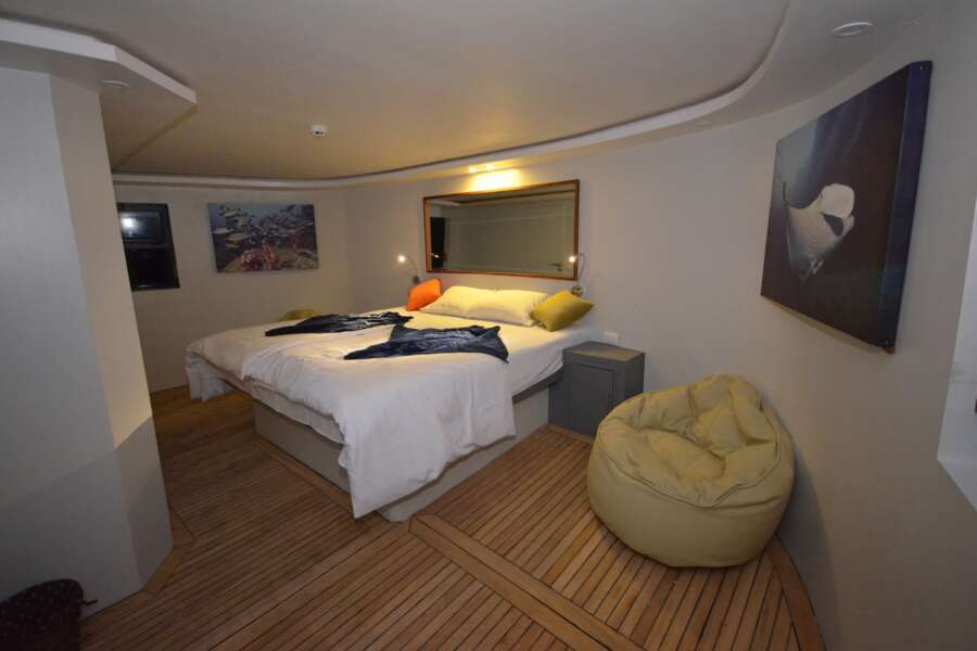 Die Masterkabine verfügt über ein Panoramafenster und hat ergänzend zu den Standardkabinen hat sie eine Minibar und einen TV.
