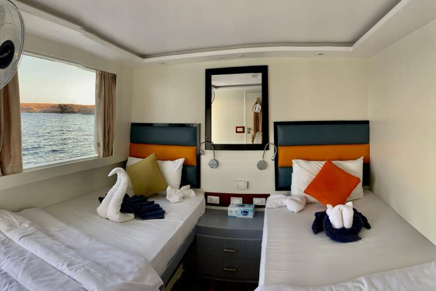 Die Doppelkabinen sind mit 2 Einzelbetten ausgestattet, die Oberdeckkabinen bieten einen schönen Blick aufs Meer.
