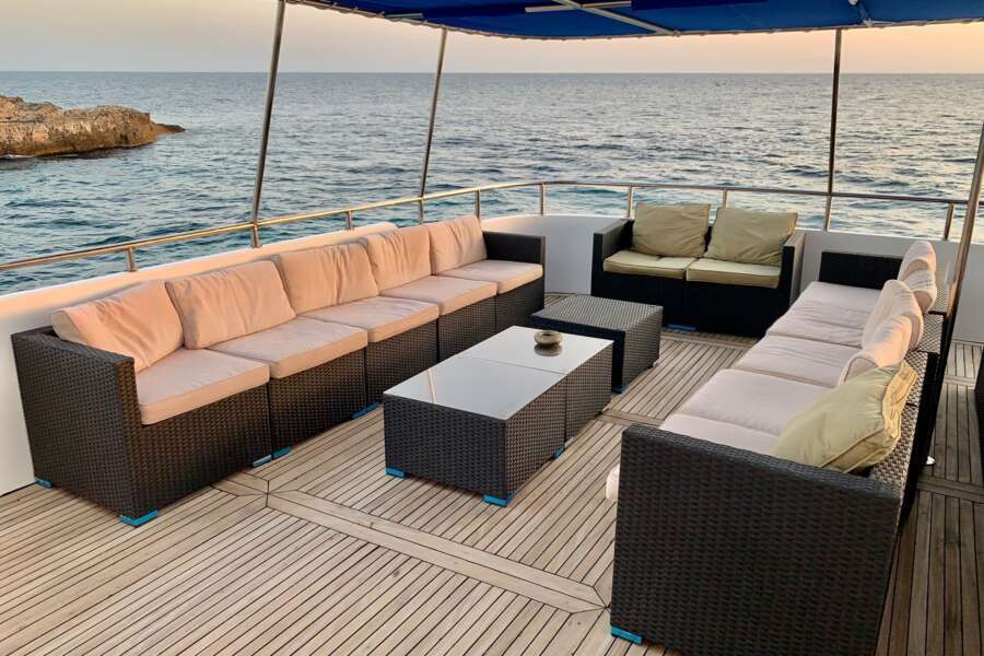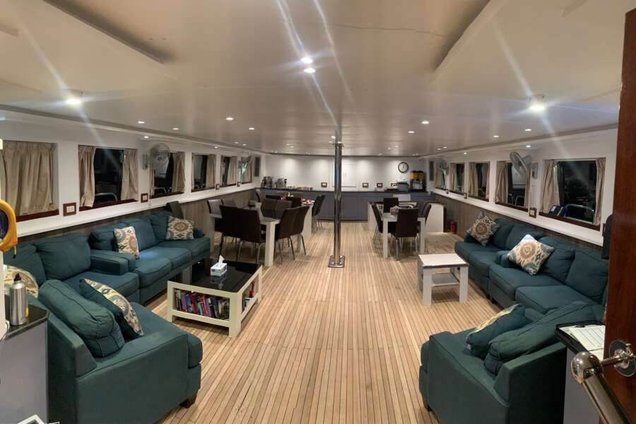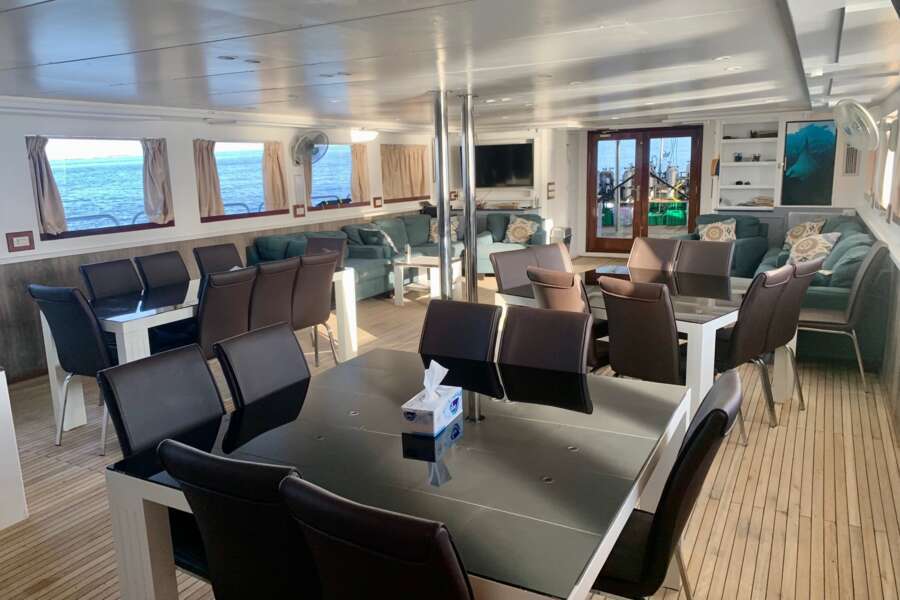 Klimatisierter Speisesaal und Aufenthaltsraum, grosszügiges Sonnendeck mit überdachten Liegeflächen sowie eine gemütliche Sitzecke auf dem Oberdeck. Gut ausgestattete Taucherplattform.