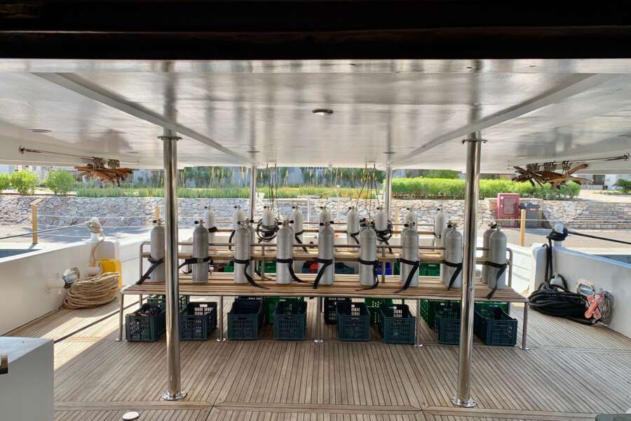 Taucherplattform Flaschenhalterungen, Hängevorrichtungen für Ausrüstung, Spülbecken, Duschen.