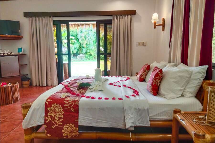 Die 10 Garten Bungalows befinden sich im hinteren Teil der Anlage inmitten eines Kokospalmenhains. Die gemütlichen Zimmer aus Bambus haben einen Ventilator oder Klimaanlage, Badezimmer mit Dusche/WC, einen kleinen, begehbaren Schrank sowie eine Terrasse mit Blick ins Grüne. 13 grösseren Deluxe Zimmer in Doppelbungalows sowie die 3 Familienzimmer haben Pool- oder Meersicht und sind mit Klimaanlage, Ventilator, TV und Minibar ausgestattet. 2 Suiten liegen im zweiten Stock oberhalb der Familienzimmer und bieten zusätzlich eine grosse Badewanne mit Whirlpool, einen Wohnbereich und einen grossen Balkon mit Bar. Wi-Fi kostenlos verfügbar.